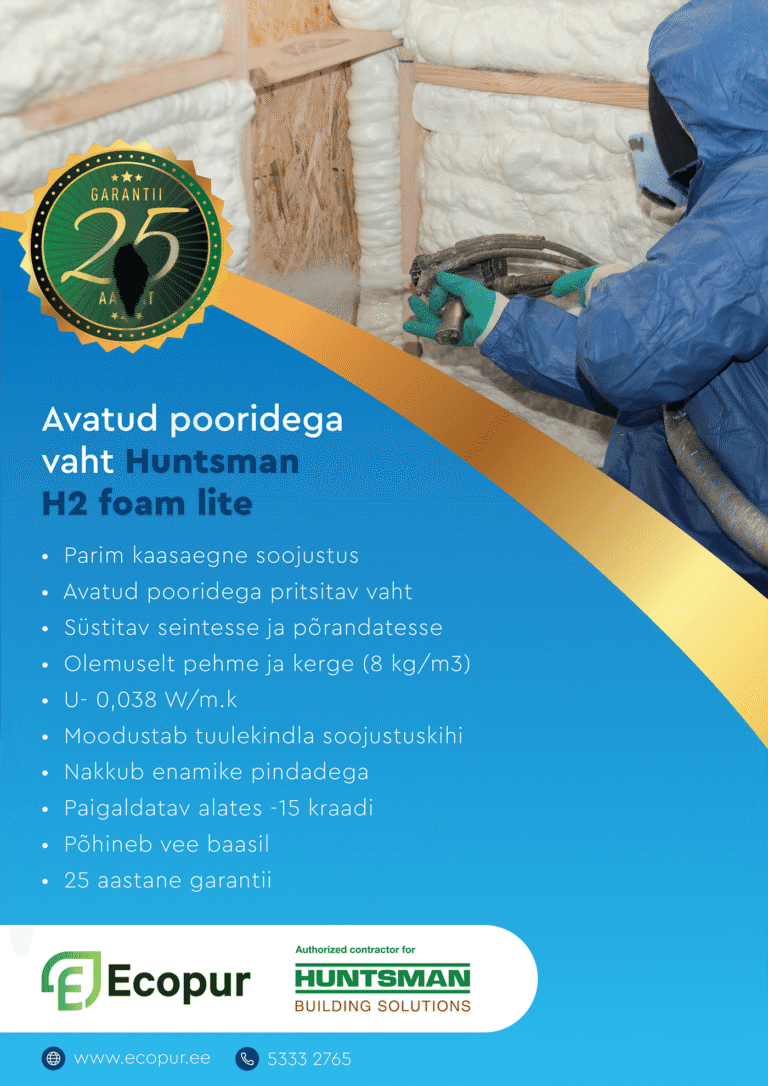 Hoia kodu sooja ja küttearved väiksena! Paigaldame kvaliteetset Huntsmani PUR vahtu kuni 15 külmakraadi juures, et tagada sinu kodu hubasus aastaringselt.